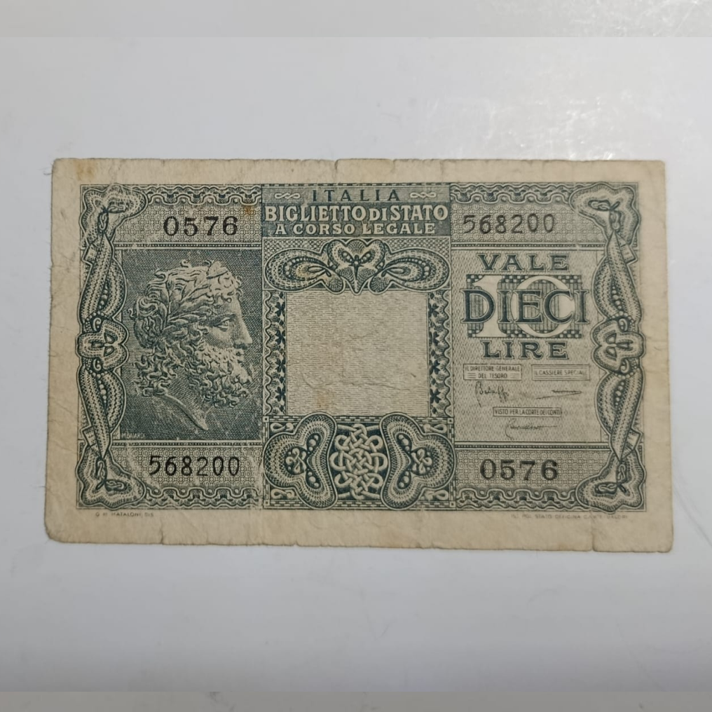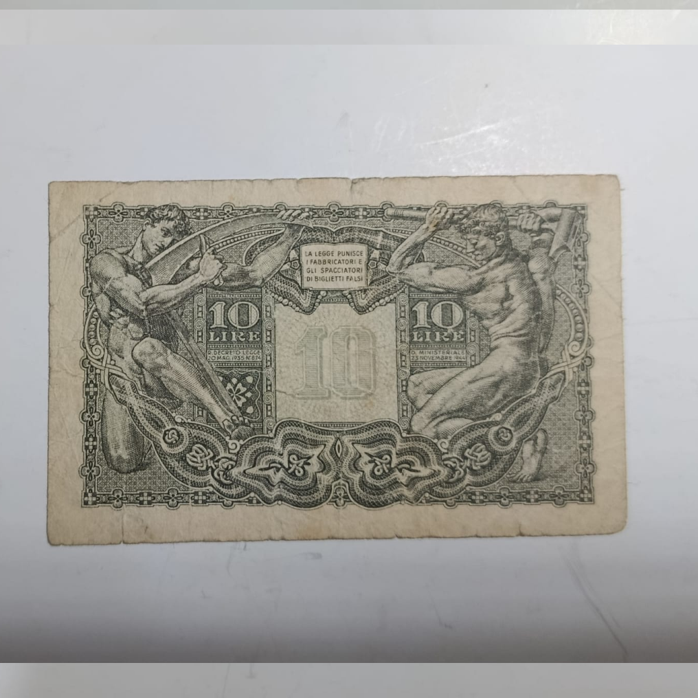 Billete de 10 Liras emitido en Italia en 1953, Serie 0576. Fabricado en papel, presenta diseño clásico con leyenda “REPVBBLICA ITALIANA” y valor enmarcado por espigas de trigo. En estado VG a XF, es una pieza representativa del período republicano italiano, valorada por su estética sobria y contexto histórico.