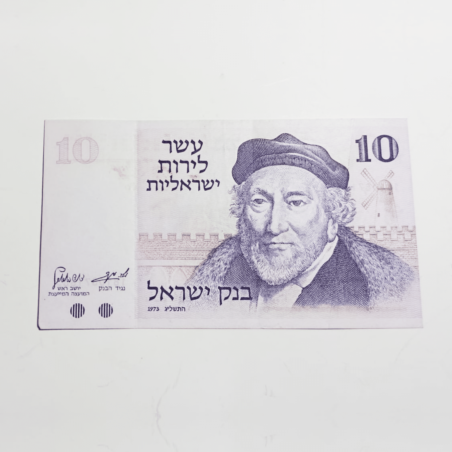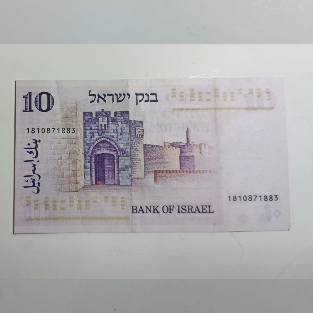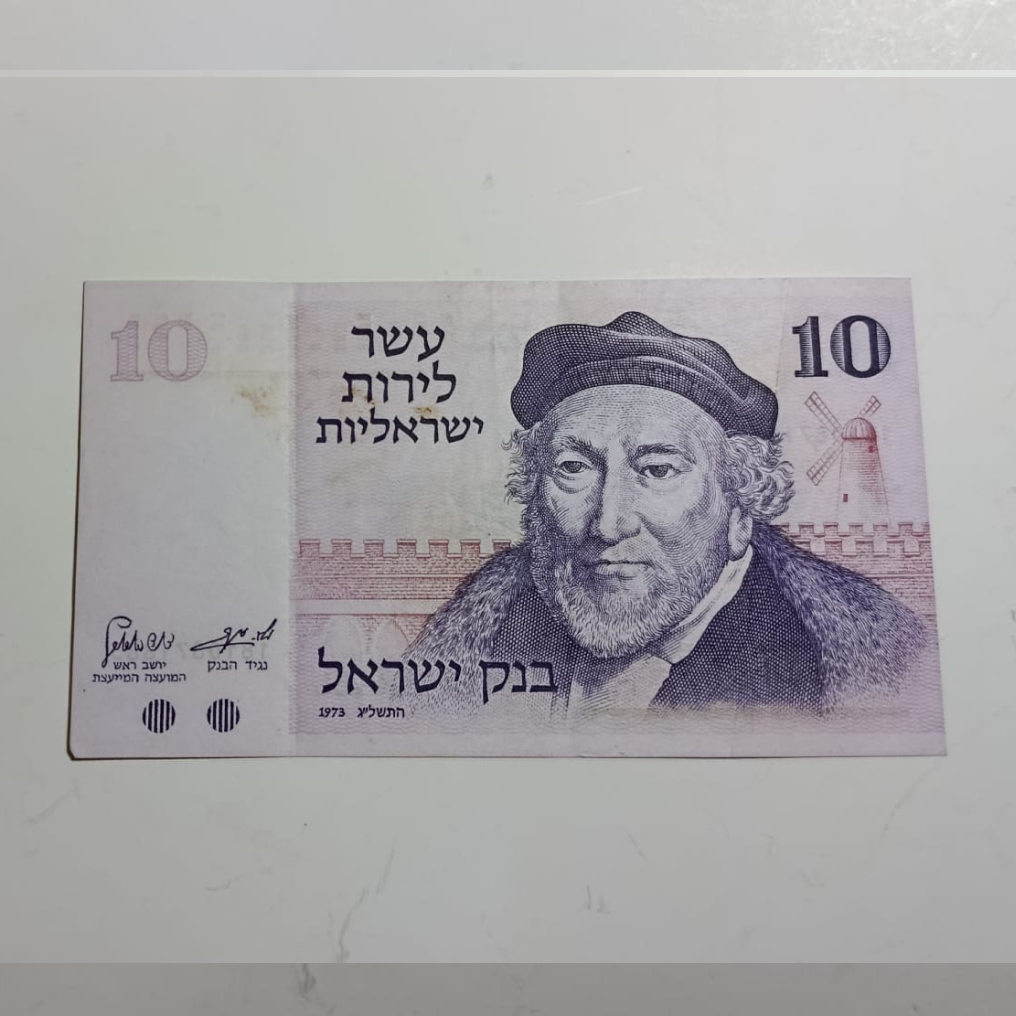 Billete de 1 Sheqel emitido por el Banco de Israel en 1973. Impreso en papel, presenta el retrato de Moshé Sharett en el anverso y una vista del edificio del Banco de Israel en el reverso. En estado VG, conserva detalles visibles con desgaste moderado. Pieza representativa del sistema monetario previo al nuevo shekel.