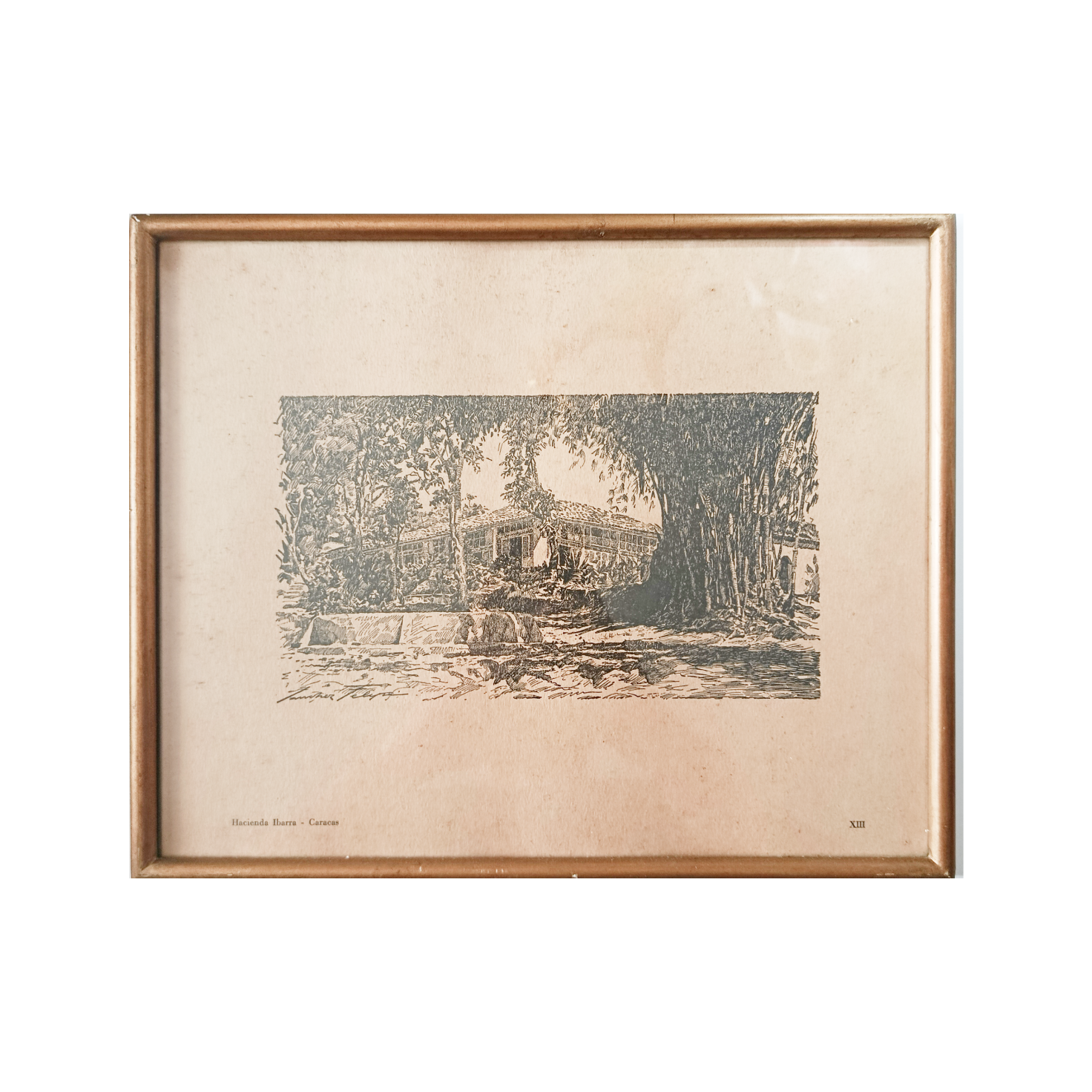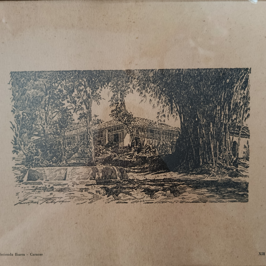 Litografía tipo grabado de la histórica Hacienda Ibarra en Caracas, con trazos detallados que evocan la arquitectura colonial y el entorno natural de la época. Pieza decorativa con valor patrimonial, ideal para coleccionistas, espacios culturales o amantes de la historia venezolana.
