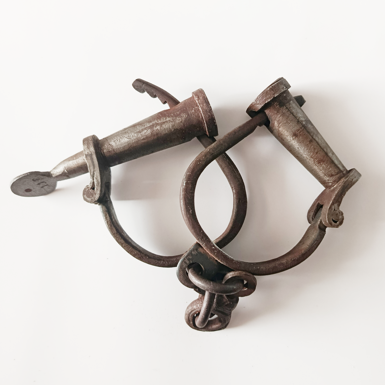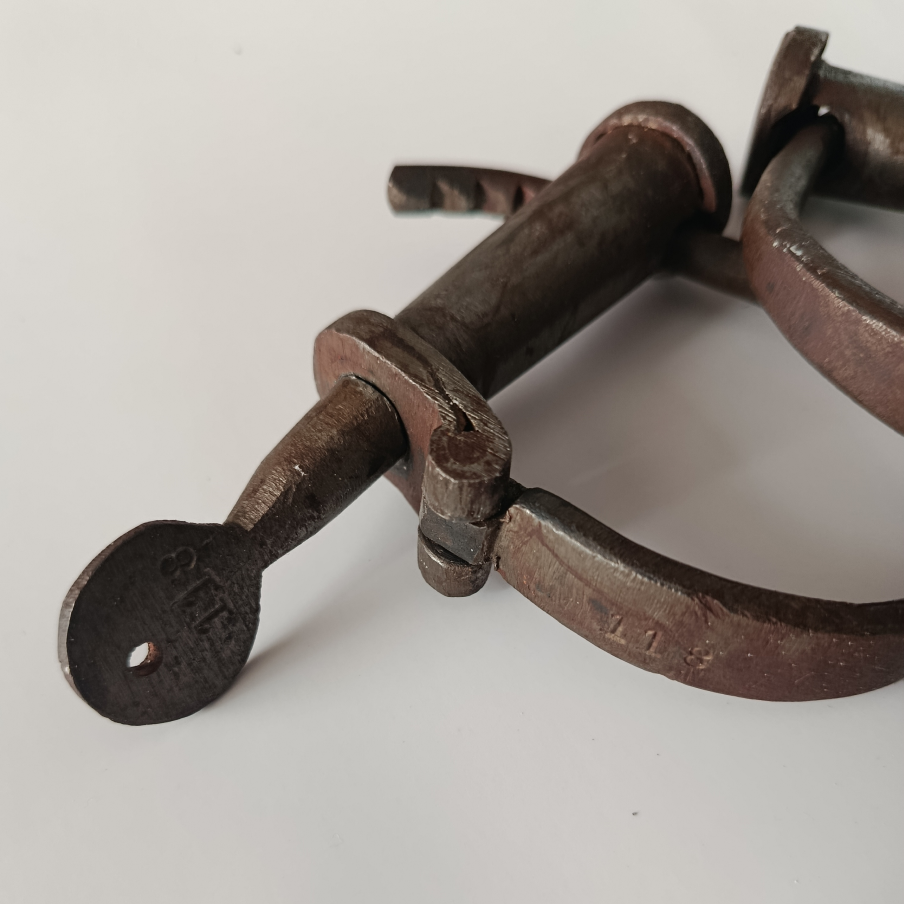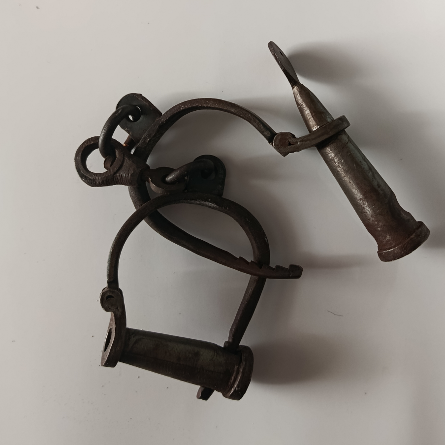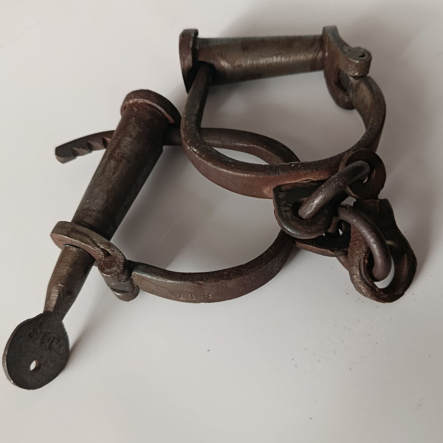 Facsímil operativa de esposas antiguas de hierro, serie 181, con llave funcional. Réplica fiel de modelo judicial del siglo XIX. Ideal para coleccionistas, museos y ambientaciones históricas.
