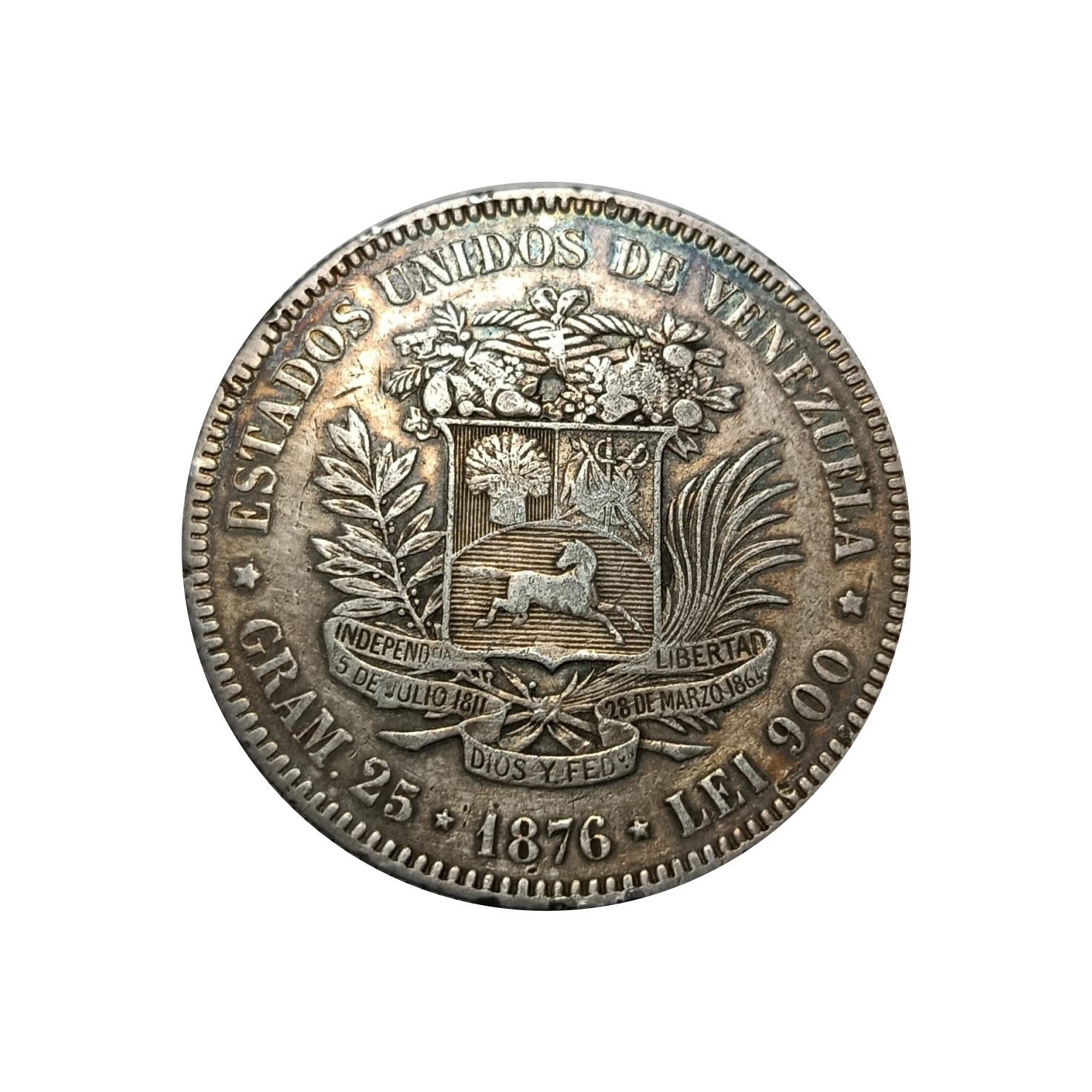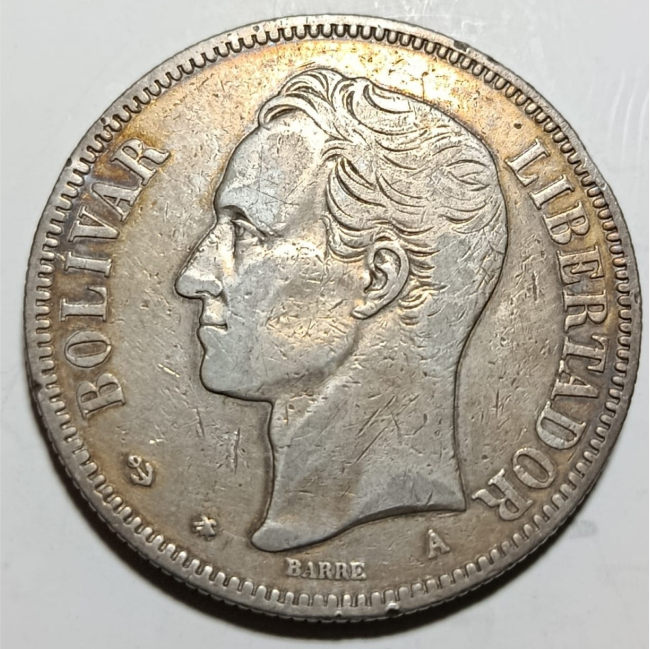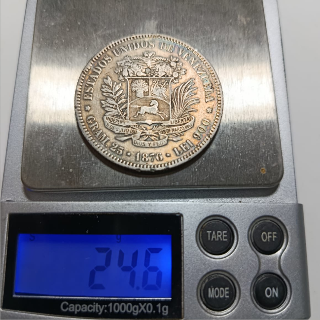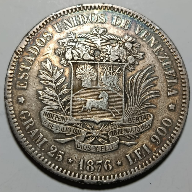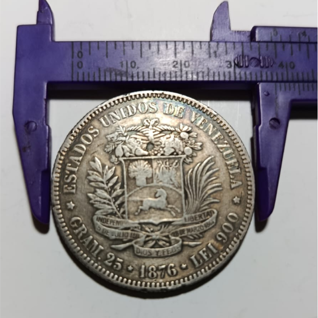 Moneda venezolana de 1 Venezolano, año 1876, popularmente conocida como “el primer Fuerte”. Acuñada en plata ley 900, presenta la efigie de Bolívar en el anverso y el escudo nacional en el reverso. Pieza histórica de gran valor numismático, ideal para coleccionistas y vitrinas patrimoniales.