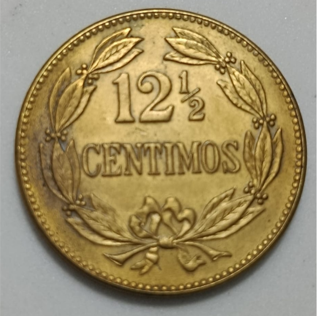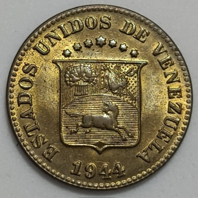 Moneda venezolana de 12 ½ céntimos, año 1944, acuñada en latón. Presenta el valor facial rodeado por ramas de laurel en el anverso y el escudo nacional en el reverso. Pieza histórica de la era republicana, ideal para coleccionistas y vitrinas patrimoniales.