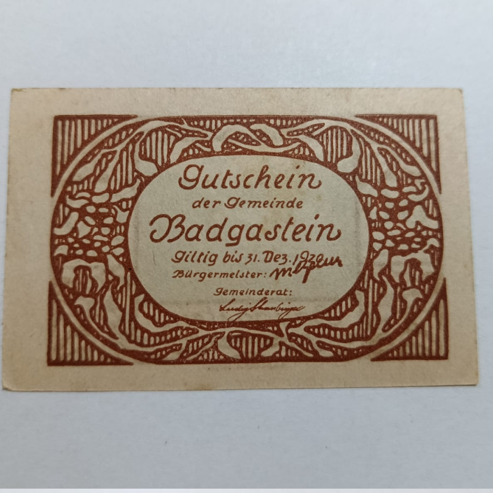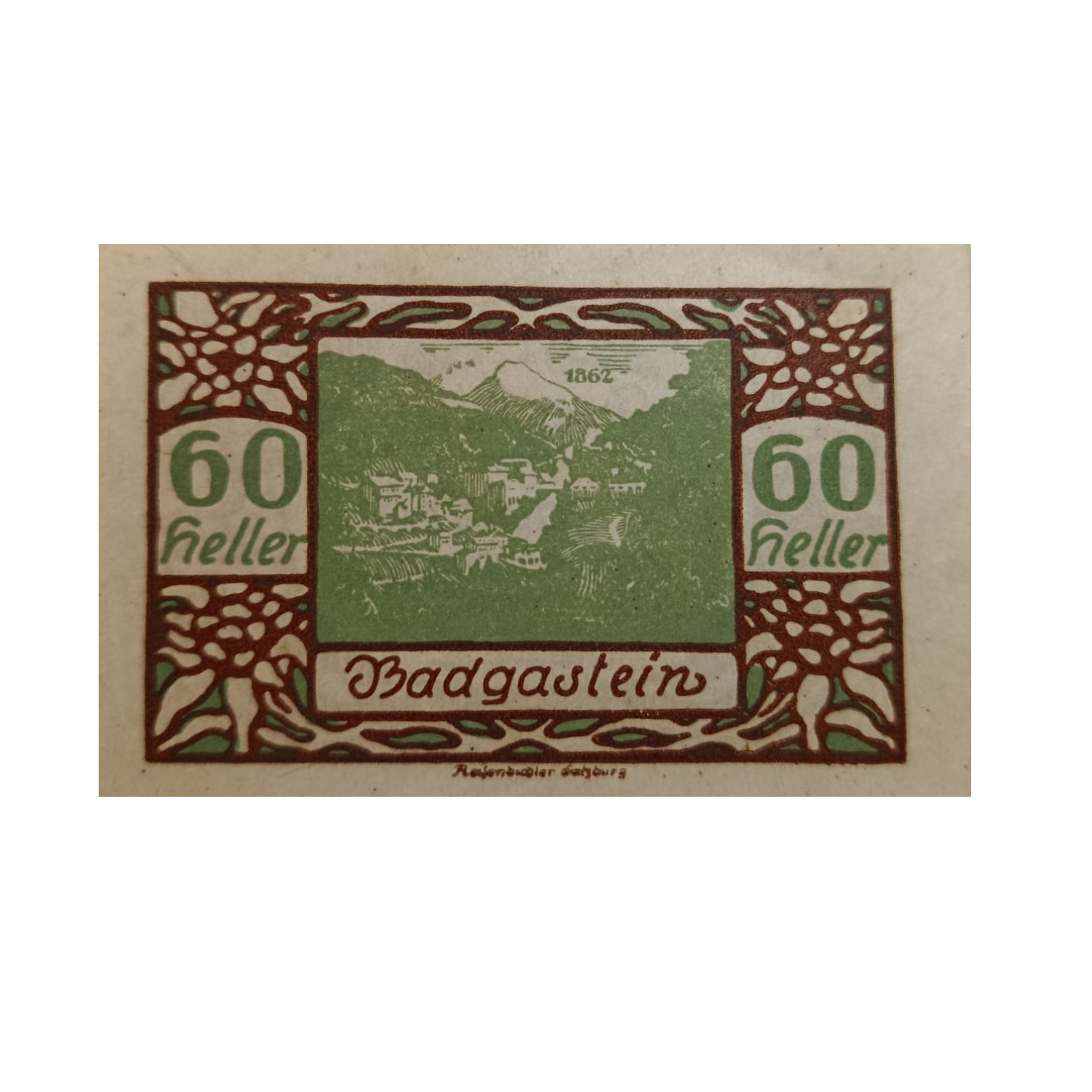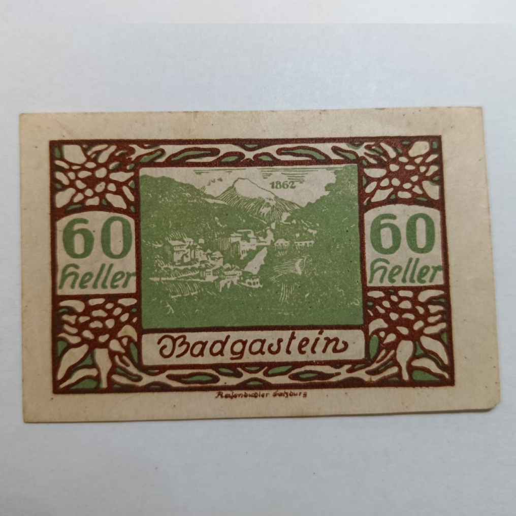Billete de 60 Heller – Bad Gastein, Austria (1920). Notgeld local emitido durante la Primera República. Papel rectangular de 82 × 52 mm, desmonetizado el 31/12/1920. Pieza histórica en condición XF, ideal para coleccionistas.