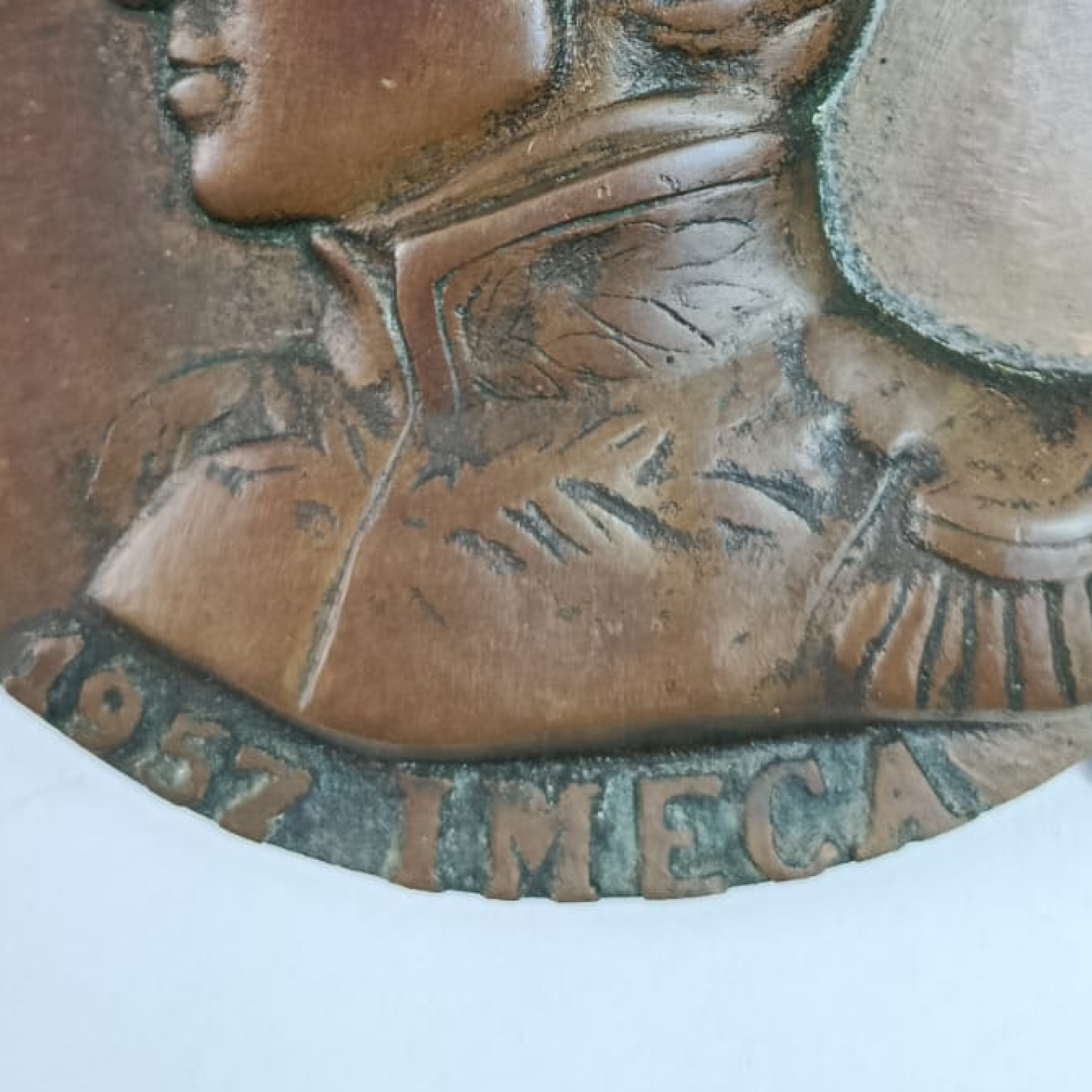 Placa en bronce Imeca 1957, pieza única de 15,5 cm de circunferencia y 753 g de peso. Conservada en condición XF, destaca por su rareza y solidez histórica. Ideal para coleccionistas exigentes.