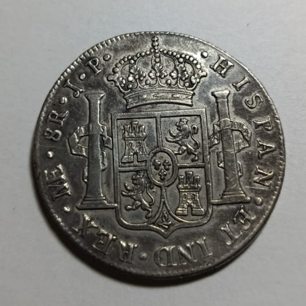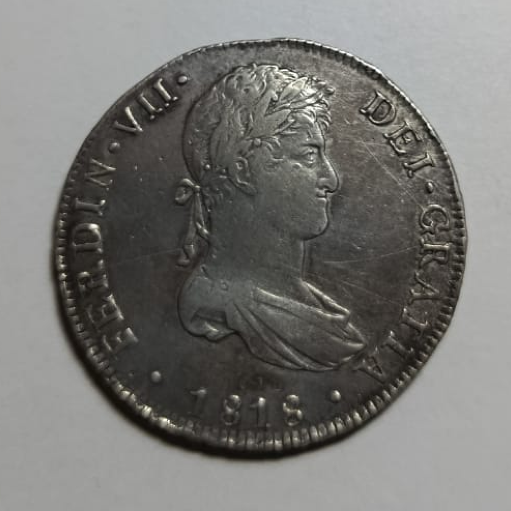 Moneda colonial de 8 reales acuñada en Lima, Perú, en el año 1818, durante el reinado de Fernando VII. Fabricada en plata de alta ley, esta pieza representa el poder imperial español en América en plena época de transición hacia la independencia. Presenta el busto laureado del monarca en el anverso y el escudo real entre columnas en el reverso, con leyendas en latín y español. Su peso, diámetro y diseño la convierten en una pieza clave de la numismática virreinal hispanoamericana.