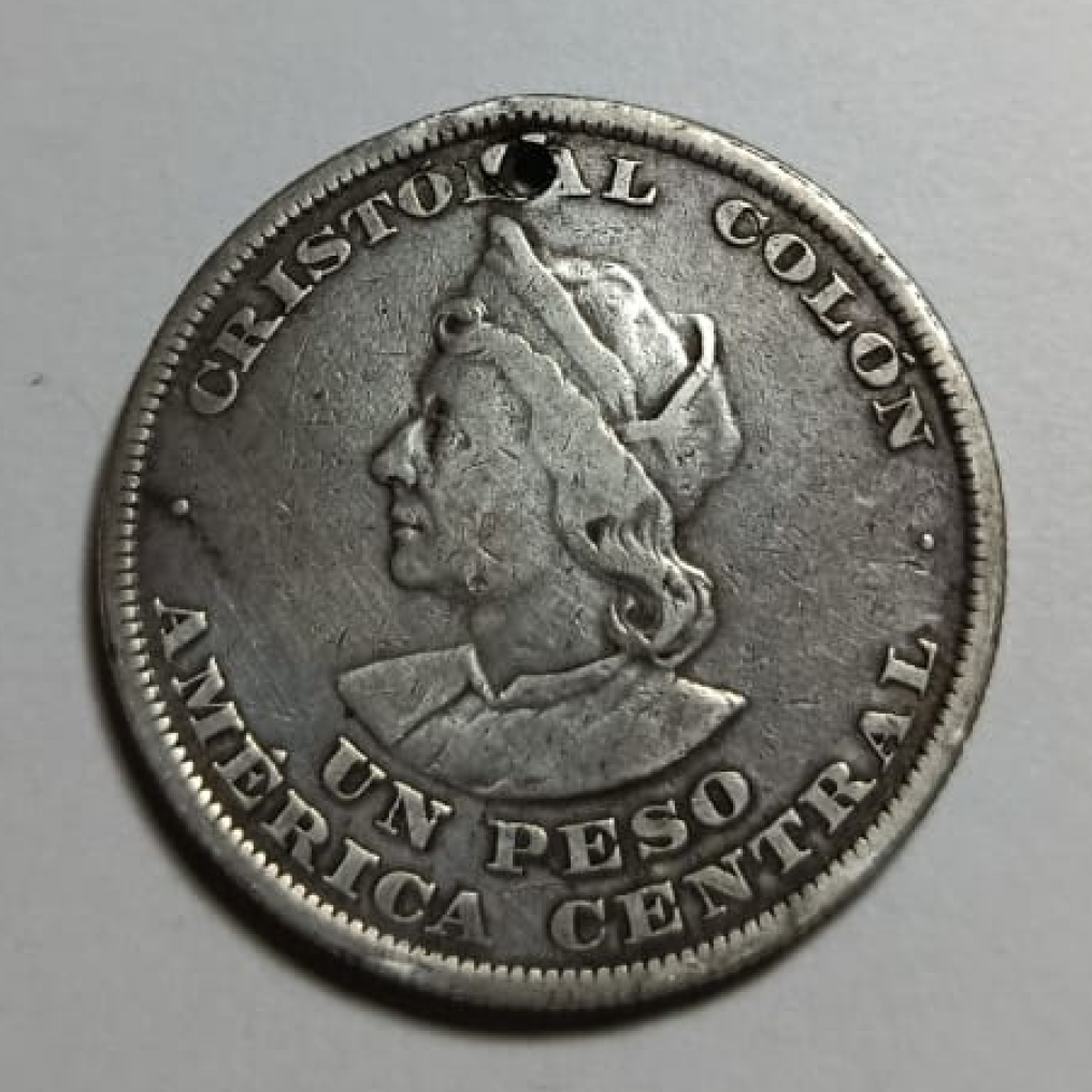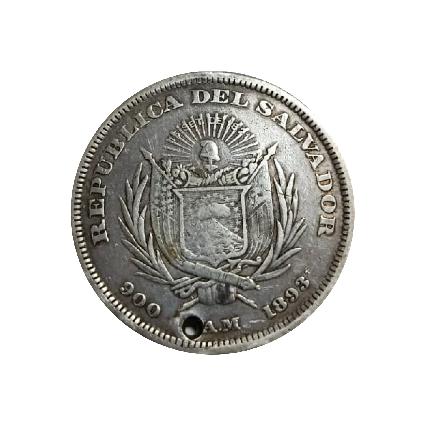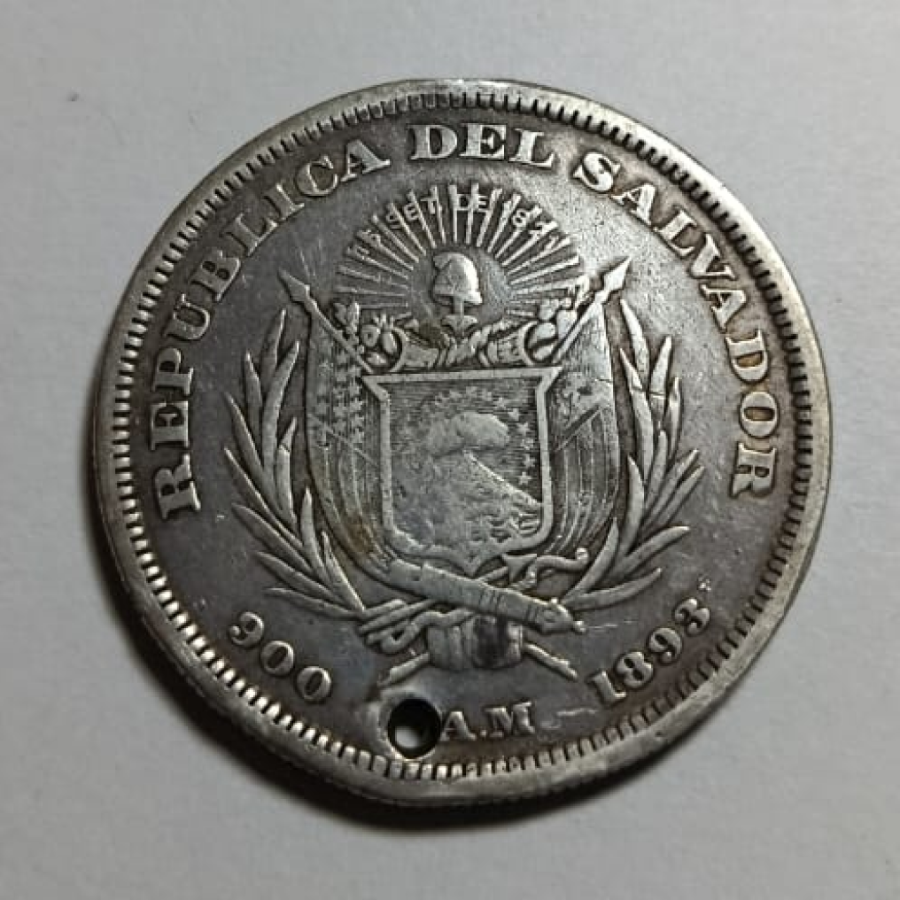 Moneda de 1 peso acuñada en 1893 por la Casa de Moneda de El Salvador (C.A.M.), en plata .900. Presenta el busto de Cristóbal Colón en el reverso y el escudo nacional en el anverso. Pieza histórica de gran valor numismático