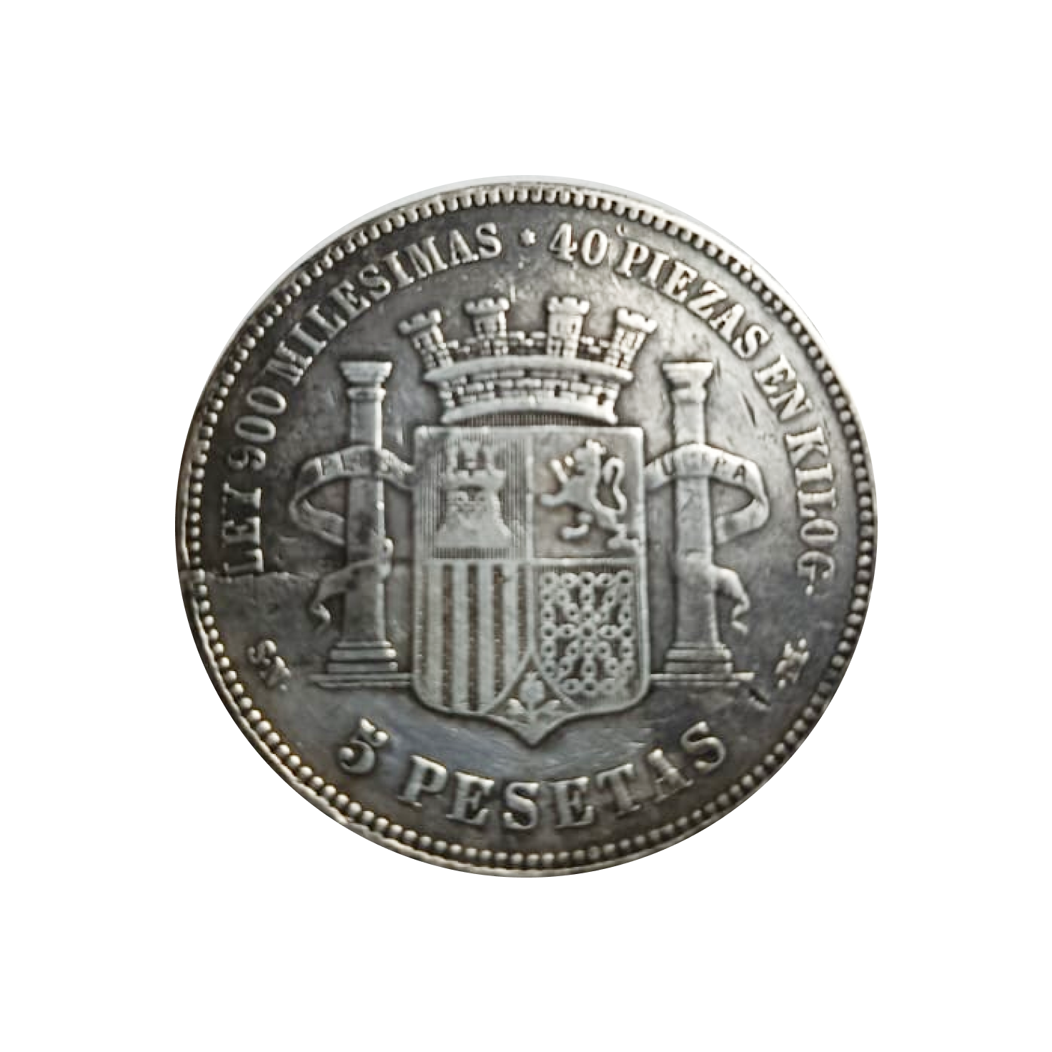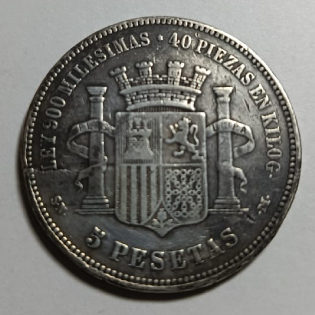 Moneda de 5 pesetas acuñada en 1870 por el Gobierno Provisional español. Fabricada en plata .900, presenta la alegoría de Hispania recostada en el anverso y el escudo nacional en el reverso. Pieza emblemática del periodo de transición política, con alto valor numismático y estético.