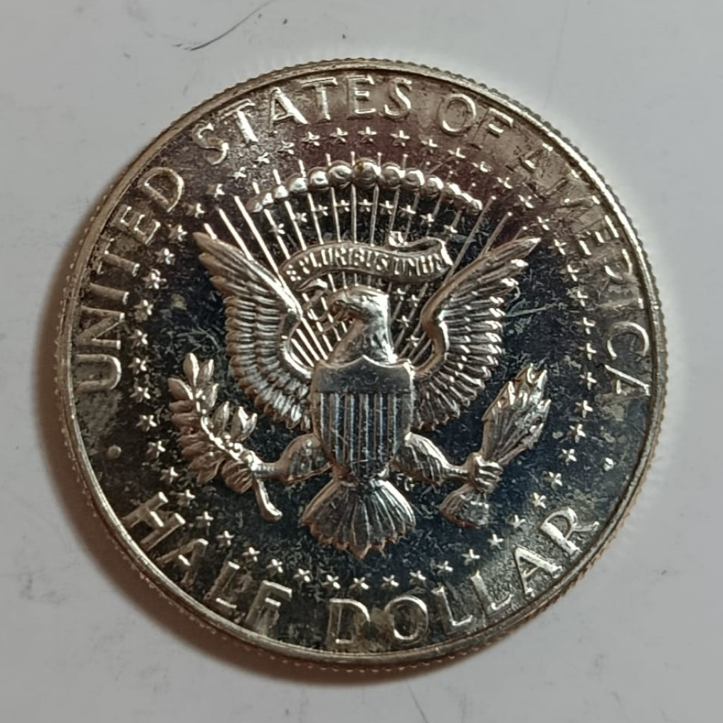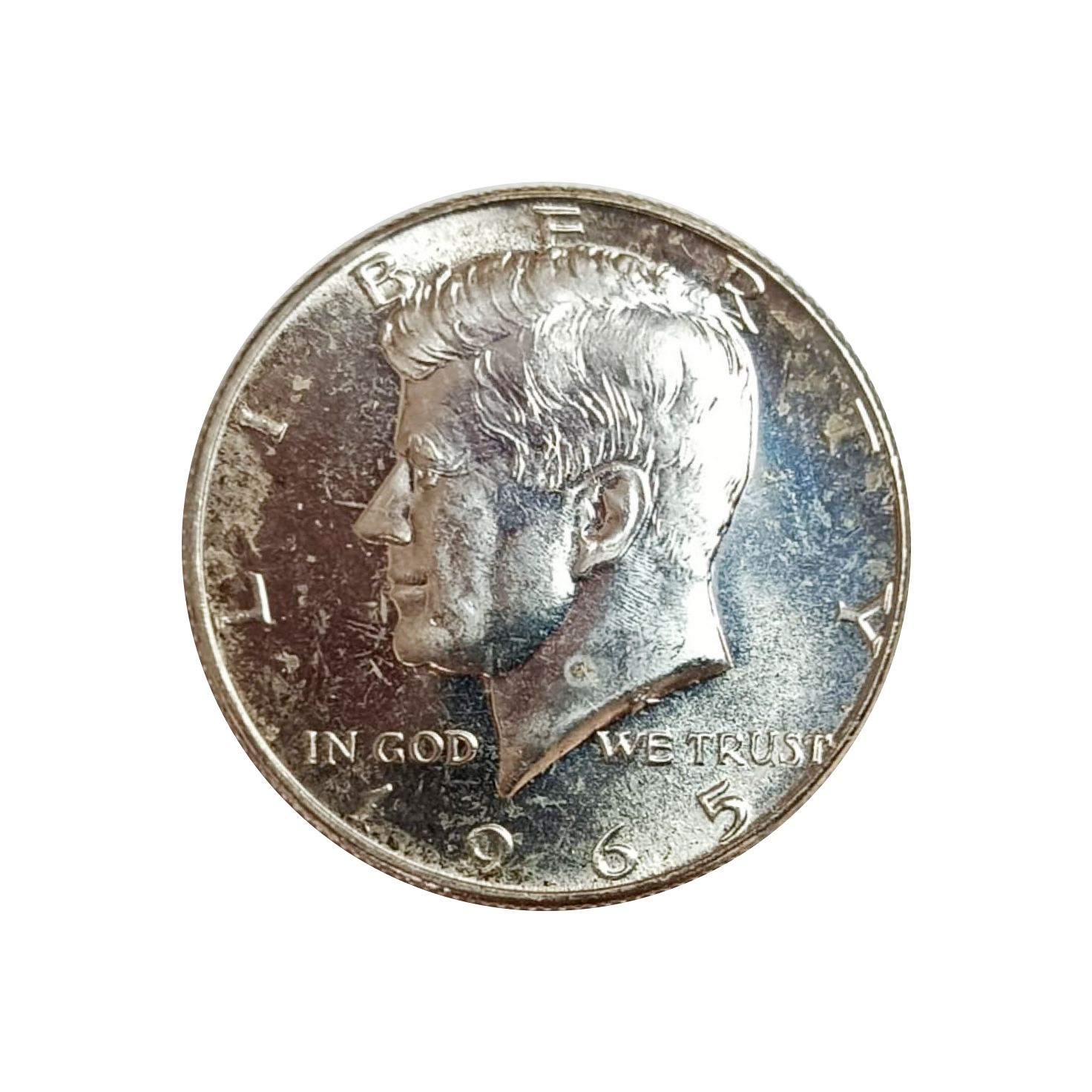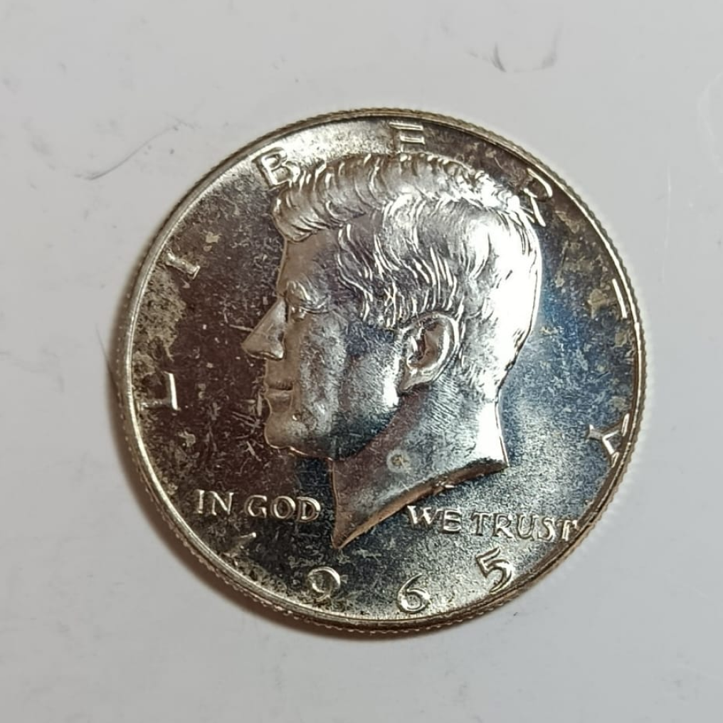 Half Dollar Kennedy 1965, 40% plata, sin marca de ceca. Diseño de Roberts y Gasparro. Estado XF: detalles visibles, leve desgaste. Peso: 11.5 g, diámetro: 30.6 mm, canto estriado.