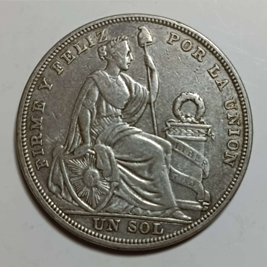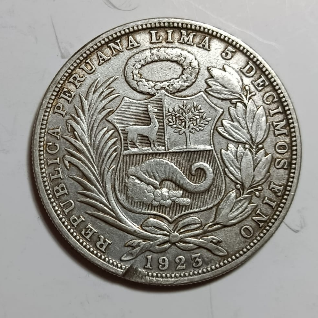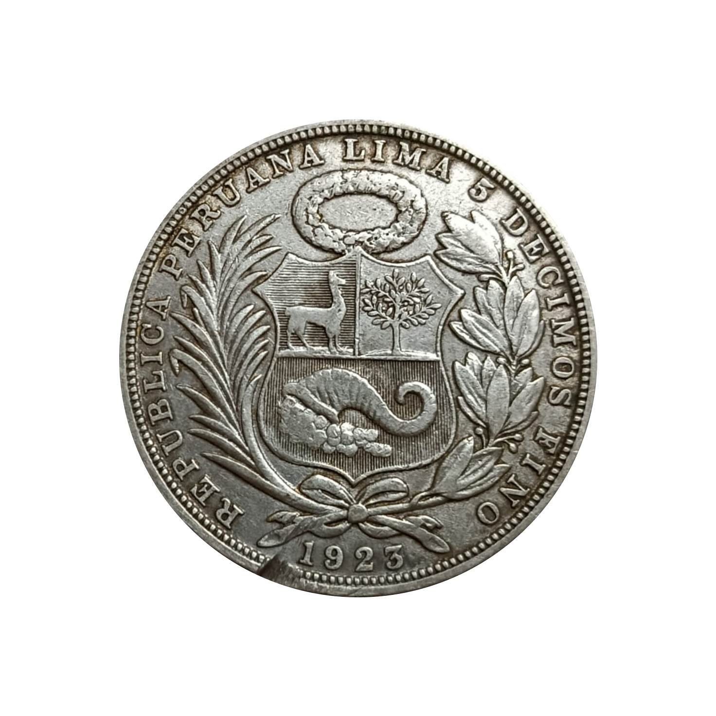 5 Décimas Perú 1923, plata .900, ceca Filadelfia. Estado XF: detalles nítidos, leve desgaste. Peso: 2.5 g, diámetro: 17 mm, canto estriado.