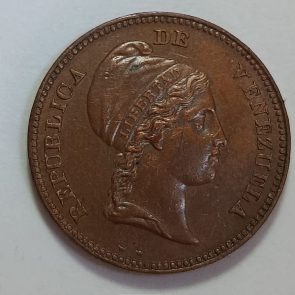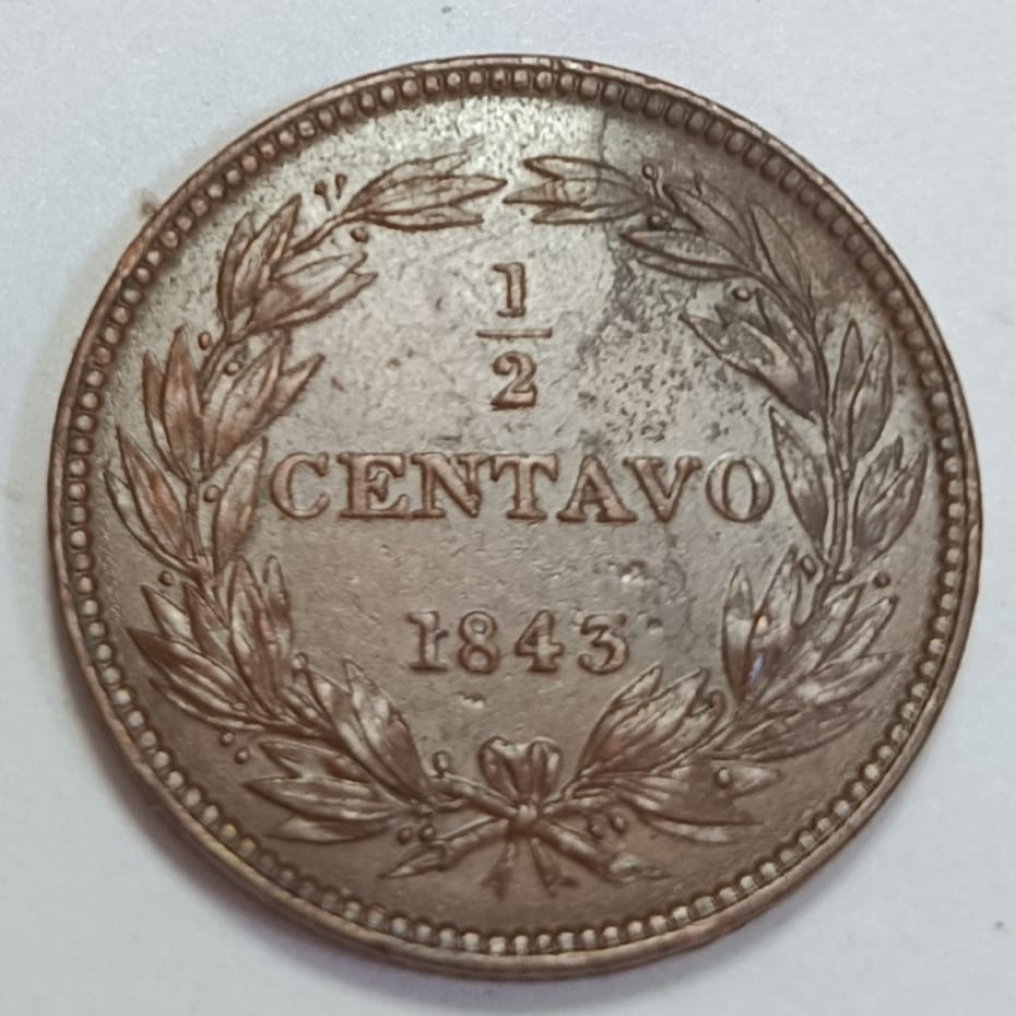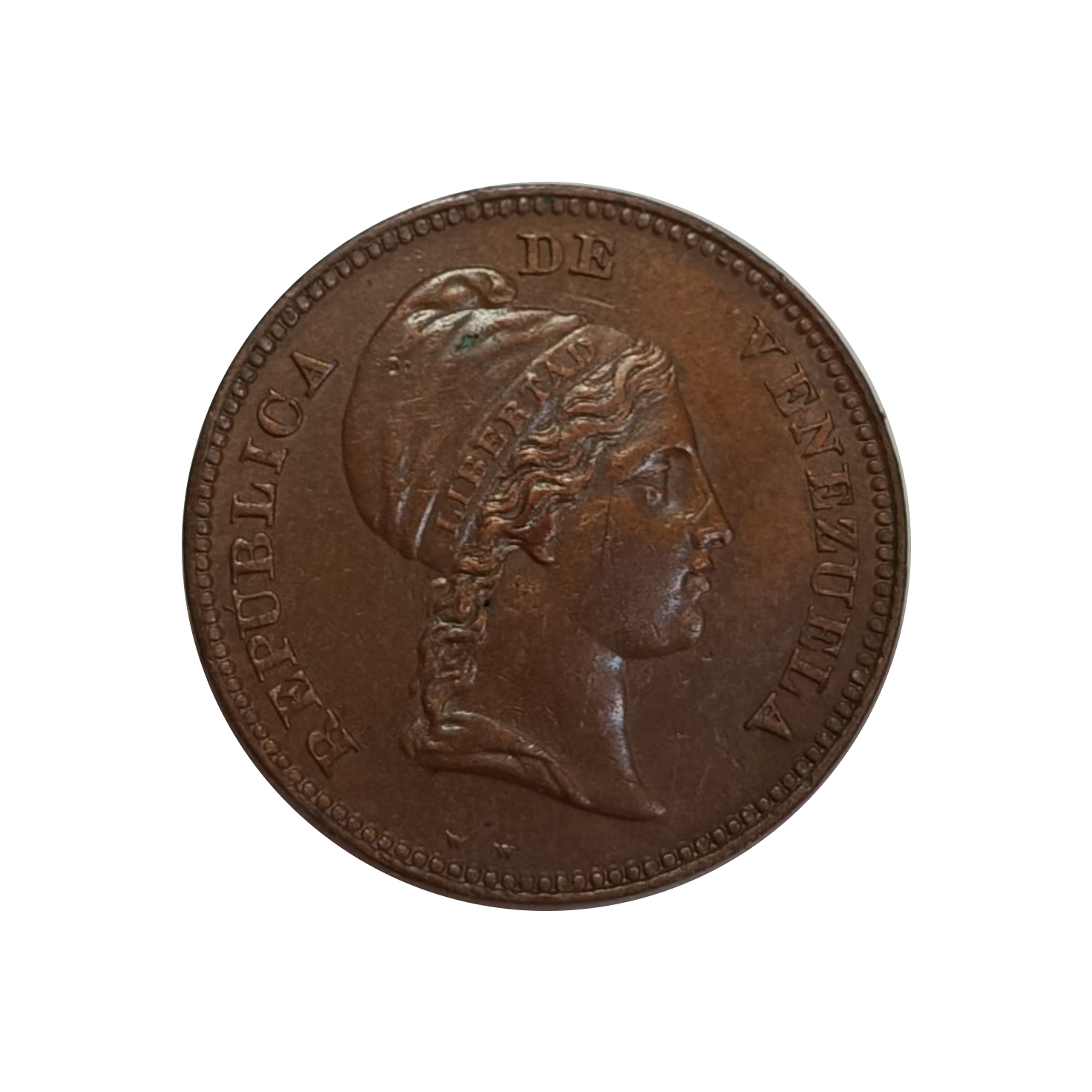 La moneda venezolana de ½ centavo de 1843 fue acuñada en Caracas durante la etapa republicana posterior a la independencia. Fabricada en cobre, con 20 mm de diámetro y canto liso, representa una de las primeras emisiones fraccionarias del país. El anverso muestra el escudo nacional rodeado por la leyenda “REPUBLICA DE VENEZUELA · 1843 ·”, mientras que el reverso presenta el valor “½” centrado dentro de una corona de laurel. Su diseño sobrio y simbólico refleja el esfuerzo por consolidar una identidad monetaria propia. En estado AU, conserva buena definición y pátina uniforme. Es una pieza escasa y valiosa para colecciones del siglo XIX venezolano.