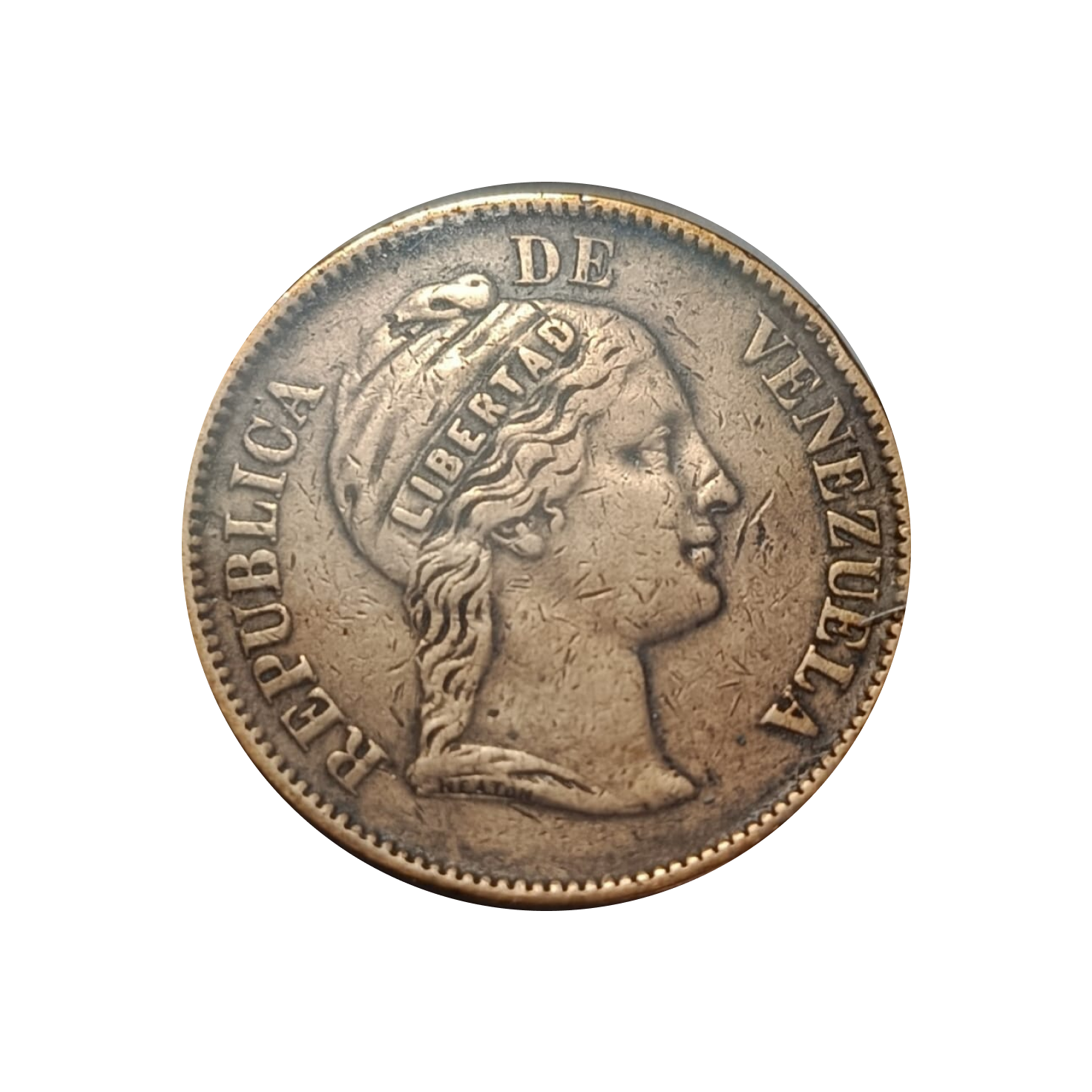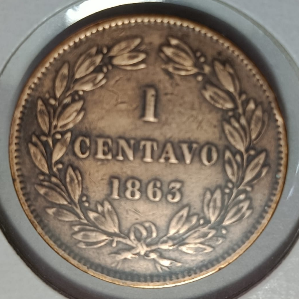 La moneda venezolana de 1 centavo de 1863 fue acuñada en París durante el periodo de los Estados Unidos de Venezuela, reflejando el ideal federalista en su diseño. Fabricada en bronce, con 25 mm de diámetro y canto liso, presenta en el anverso el escudo nacional rodeado por la leyenda “ESTADOS UNIDOS DE VENEZUELA · 1863 ·”. El reverso muestra el valor “UN CENTAVO” en letras grandes dentro de una corona de laurel. Su estilo sobrio y republicano la convierte en una pieza clave de la transición monetaria postindependentista. En estado AU, conserva gran parte de su relieve y pátina uniforme.