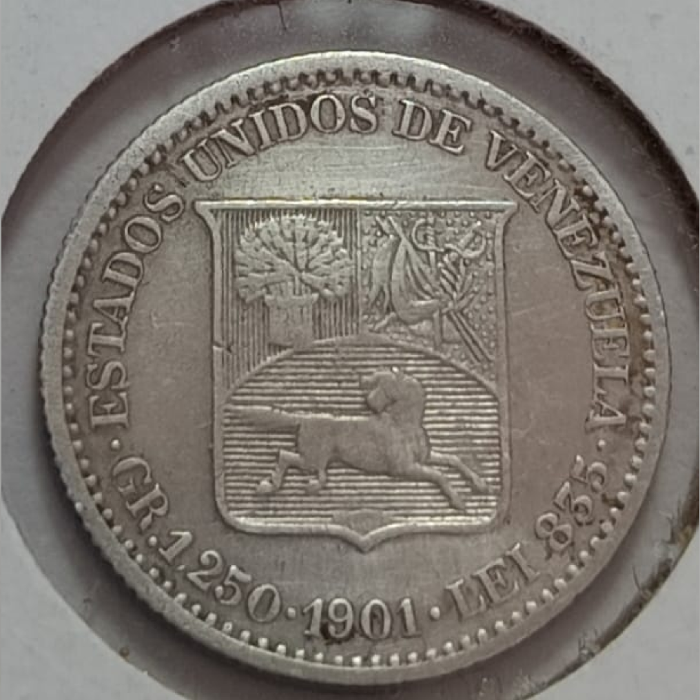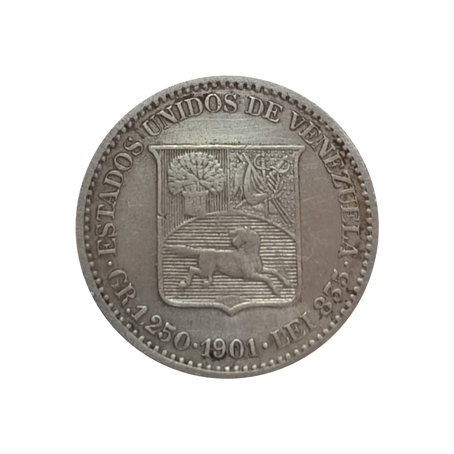 Venezuela, 1901. Moneda de 25 centavos en plata ley 0.835, acuñada en París (marca “A”). Diseño de Barre, busto de Bolívar al reverso y escudo nacional al anverso. Peso: 1.25 g · Diámetro: 15.9 mm · Canto estriado · Estado XF: excelente detalle con desgaste leve. Pieza histórica y coleccionable.